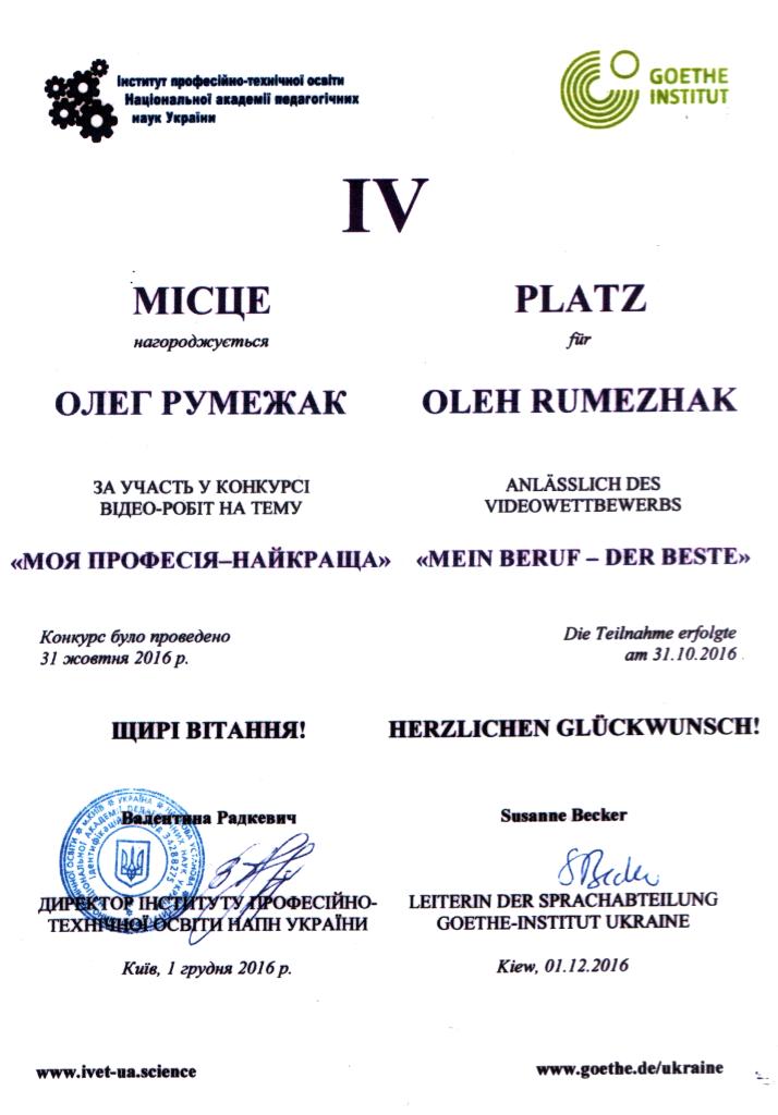 1 грудня Румежак Олег взяв участь у святковому врученні призів і подарунків у Інституті професійно-технічної освіти НАПН України у м.Києві. В училище він повернувся із сертифікатом, пакетом навчальної літератури на німецькій мові, і головне – із запрошенням на тижневу практику в Інституті електрозварювання ім.Є. Патона НАН України.