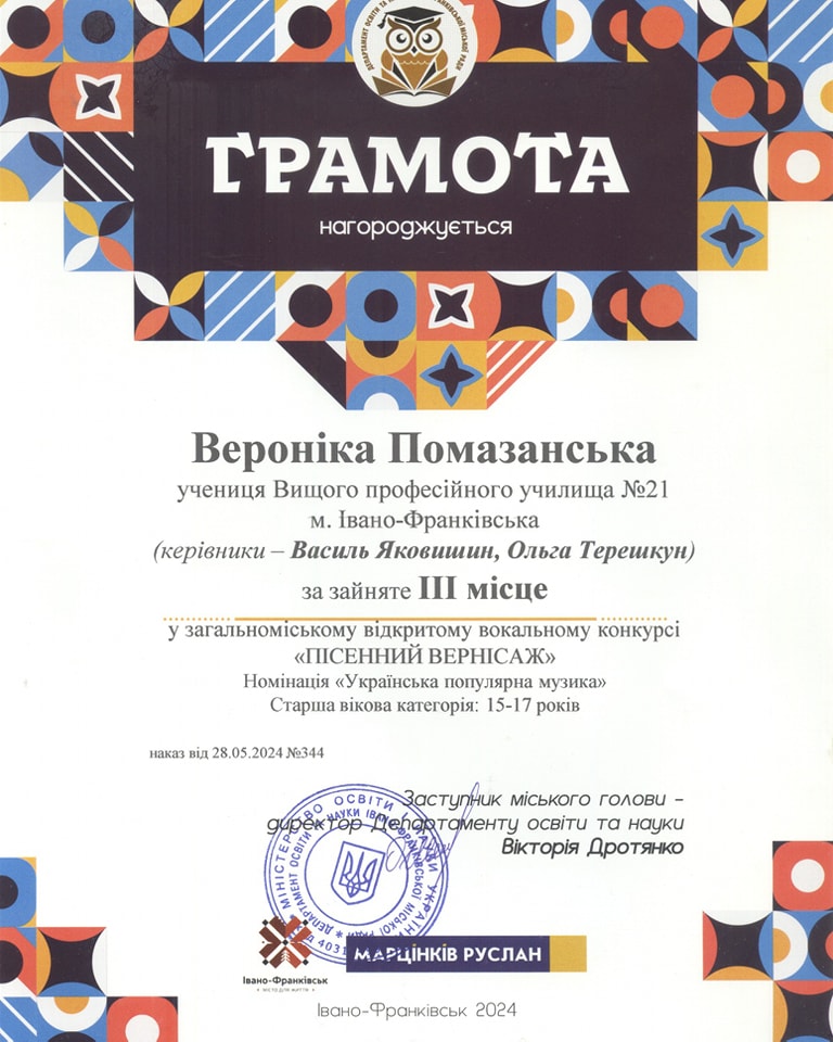 Загальноміський відкритий вокальний конкурс «Пісенний вернісаж» в номінації «Українська популярна музика» (2024 р.)
